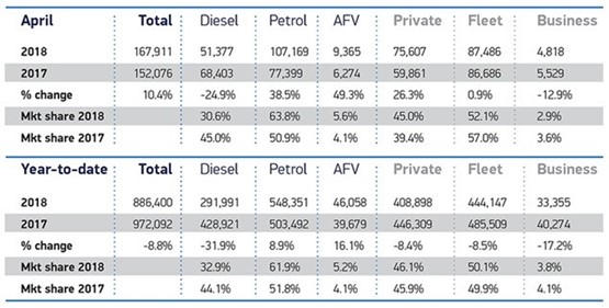 In April 2018 demand for petrol cars grew, up 38.5%, while diesel registrations continued the recent trend, declining -24.9%.