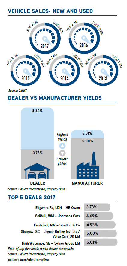 On dealer vs manufacture yields, Charlton said: “While you might expect the manufacturer covenant to generate a lower yield, 4 out of 5 of the top deals are for sites with strong dealership covenants, with the keenest yield (3.78%) being for a prime London location.
