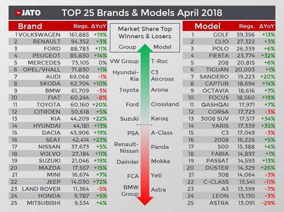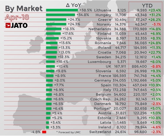 Felipe Munoz, JATO’s global analyst, said: “April 2018 was an abnormal month, as many unusual factors helped to accelerate growth.