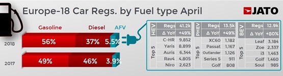 Jato’s car registrations data from 18 markets showed that diesel registrations continued to fall in April, with volume down by 13.2% to 453,500 units – a market share of 36.7%.