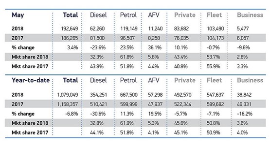 Year-to-date the market remained 6.8% down on 2017’s 186,265 registrations, which resulted from an 8.5% slump following changes to the VED road tax legislation, with 192,649 new vehicles registered during May