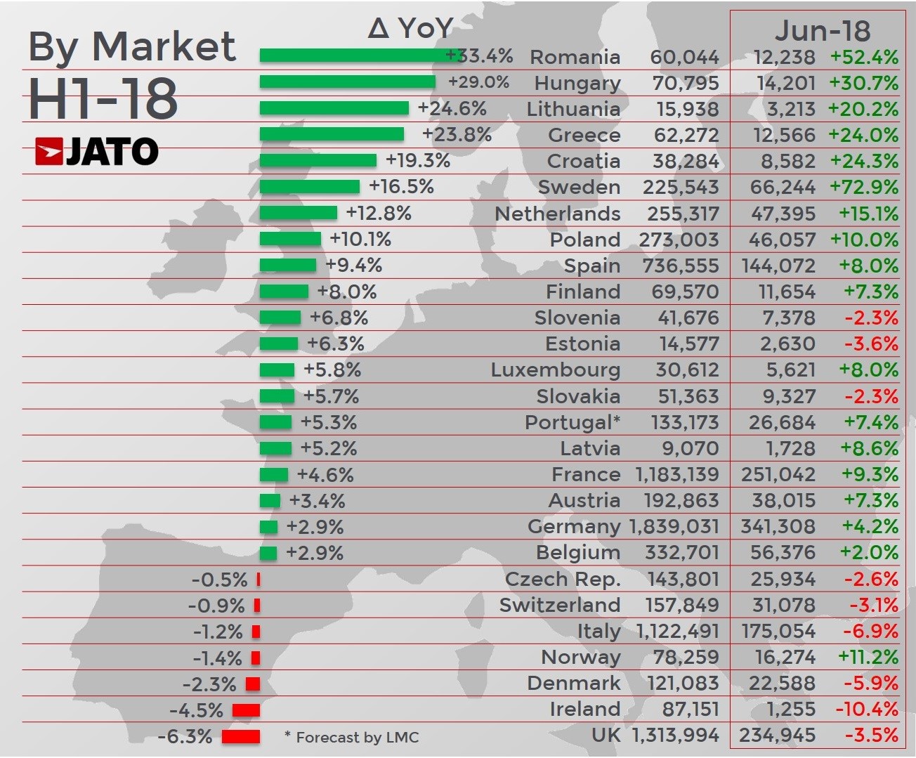 The European new car market saw growth of 2.7% to 8.66 million units in H1, despite the UK recording the biggest slow down in registrations across the continent in the first half of 2018.
