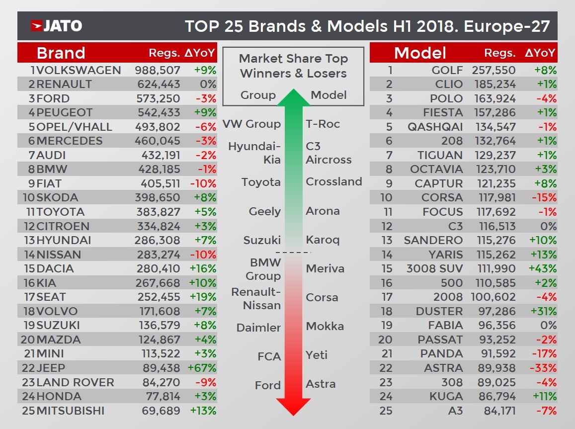 The Volkswagen T-Roc was the standout among the newest launches, recording 71,000 registrations and becoming the 32nd best-selling car in Europe. It was also a positive first half for the Citroen C3 Aircross, Opel/Vauxhall Crossland, Seat Arona, Skoda Karoq and Jeep Compass.