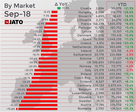 Overall, the European market saw 1.12 million vehicles registered last month – 23.4% (343,000) less than in September 2017.
