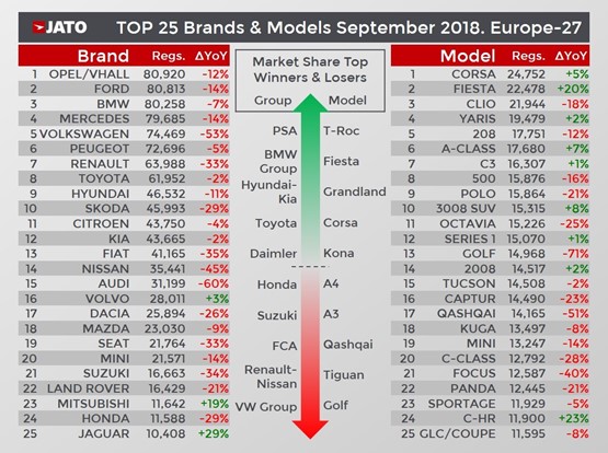 Jato said that a 10.9% decline in registrations, to 407,500 units, had resulted in a rise in market share from 31.3% in September 2017 to 36.4% in September 2018.