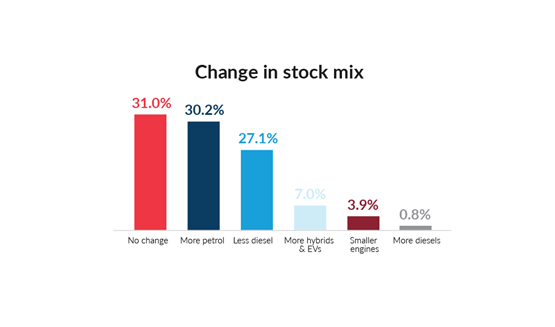 To this, it’s possible to add the 7% that have stocked more hybrids and full electric vehicles, and the 3.9% that have taken on more smaller-engined cars to arrive at 68.2% of dealers that have adjusted their stock to reduce their reliance on diesels.