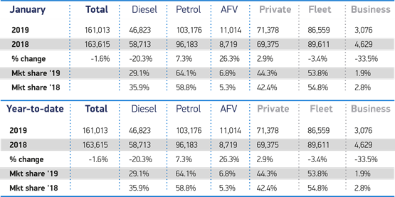 Petrol demand also grew by 7.3% in January, but this was not enough to offset another month of decline for diesel, as registrations fell by 20.3%.