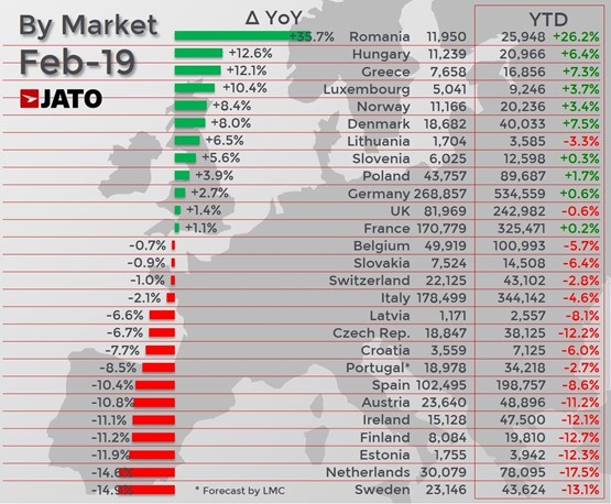 The UK was one of 12 of the European region’s nations to experience registrations growth in February, its 1.4% rise placing it 11th in the rankings.