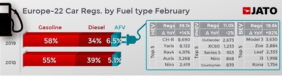 Diesel registrations fell once again in February, according to Jato’s analysis of the market, although the fuel type’s market share did stabilise at 34%.