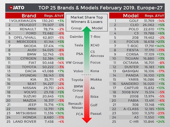 February was also a good month for the new generations of the Volkswagen Polo, which was Europe’s third best-selling car, and the Ford Focus, which was sixth.