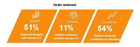 But while the latest dealer sentiment survey from Modix suggested a drop-off in consumers’ desire to invest in a new car, 62% of respondents reported that days in stock were lower than prior year.