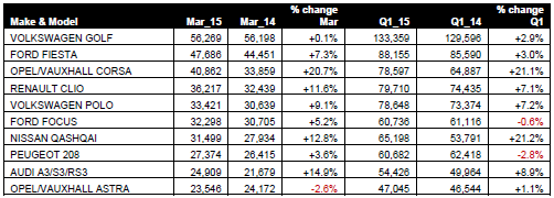 The Volkswagen Golf retained its lead of the market, increasing sales by 2.9% in Q1. The Ford Fiesta was second place for the quarter, thanks to
