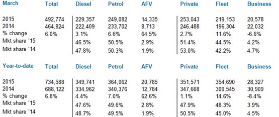 The March new car market was 6% ahead of March 2014, according to data from the Society of Motor Manufacturers and Traders, which said it is the best monthly performance since the twice-yearly number plate changes were introduced.