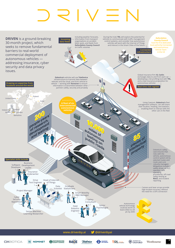 DRIVEN’s partners are: Oxbotica; Oxford Robotics Institute; XL Catlin, the global re/insurer; Nominet; Telefonica O2 UK; TRL; the UK Atomic Energy Authority’s RACE business unit; Oxfordshire County Council; Westbourne Communications; and Transport for London.