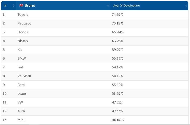Taking the top five models from each brand, Carspring discovered that Toyota models lost the most value, at 74.59%, with Peugeot and Honda following behind with 70.19% and 65.94% respectively.