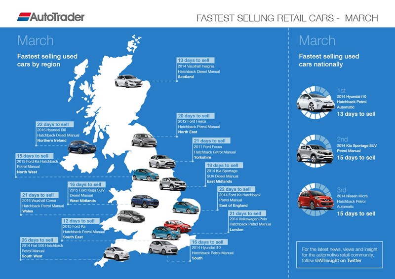 Korean product dominated the rankings of Auto Traders fastest selling cars during March, with the Hyundai i10 topping the table and four Kia models featuring in the top ten.