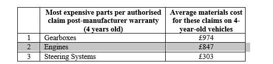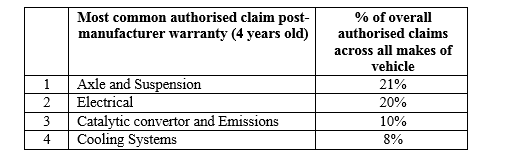 Warranty Direct has been able to examine the average cost of repairs and the most common issues that occur once a manufacturer warranty has expired. Manufacturer warranties typically last for three years so Warranty Direct has analysed authorized claims made across four-year-old vehicles.
