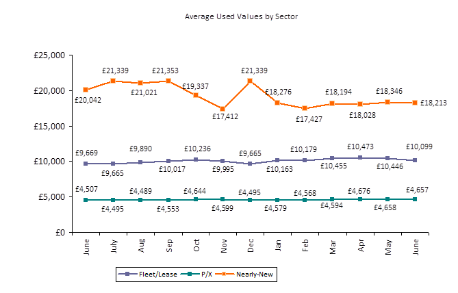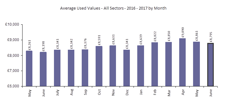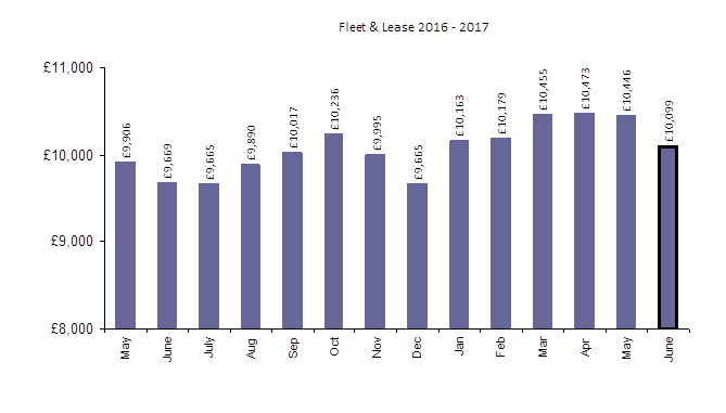 Average values in the fleet and lease sector declined by £347 (3.3%) compared to May, but remained above £10,000 as they have throughout 2017.