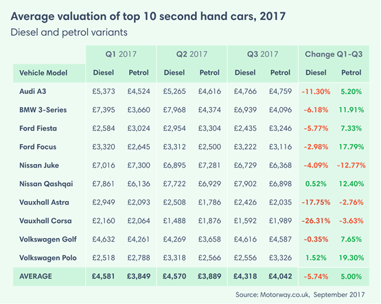 The following table shows average valuations for some of the UK’s most popular car models, comparing diesel and equivalent petrol variants.