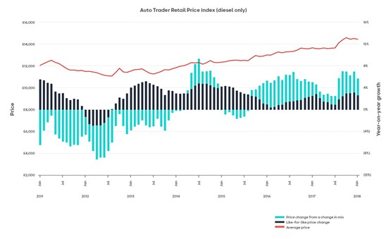 Used diesel car prices rose by 3% as the average price of a used car rose 6% during January, according to Auto Trader’s Retail Price Index.