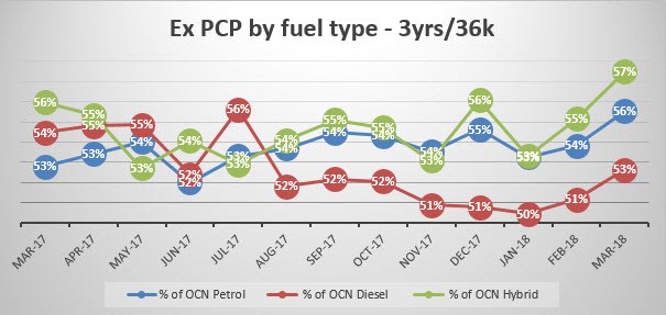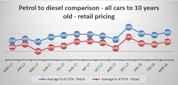 A year ago, the difference between petrol and diesel retail values expressed as a percentage of original cost new was 3%.