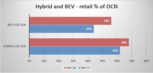 From March 2017 to the same period this year, retail values as a percentage of cost new for BEV’s have increased by 12%.