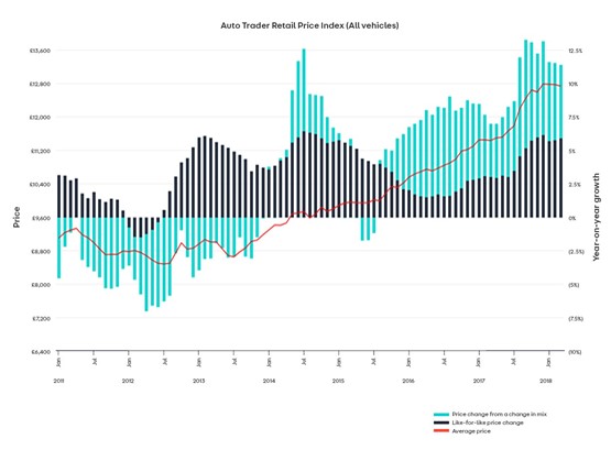 The price of an average diesel used car rose by 3% year-on-year to £14,453 in March – £53 up on February and £905 above March 2017 – as petrol car prices rose by 10% year-on-year.