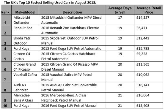 The diesel-powered version of Mitsubishi’s Outlander SUV was the fastest-selling used car on Auto Trader during August – taking an average of just 17 days to leave forecourts.