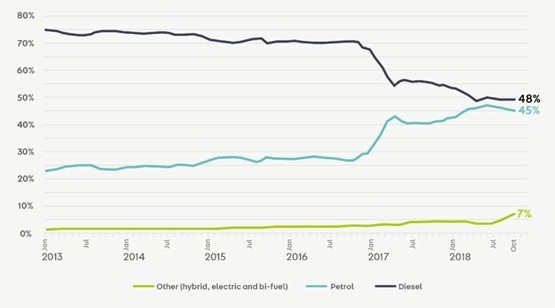 From October 2017 to October 2018, the Index recorded a 34% increase in AFVs being sold. Much of the growth has come from an increase in petrol hybrids and petrol plug-ins.