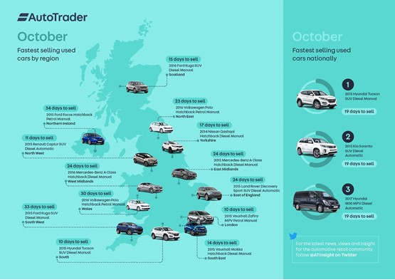 Auto Trader’s fastest-selling cars data showed that, regionally, what it called “the workhorses of the used car market”, namely SUVs and hatchbacks, dominated the list with SUVs claiming victory in East England (2015 Land Rover Discovery Sport - diesel automatic – 24 days), North West (2015 Renault Captur - diesel automatic – 11 days), Scotland (2016 Ford Kuga - diesel manual – 15 days), South (2015 Hyundai Tucson - diesel manual – 10 days), South East (2015 Vauxhall Mokka - diesel manual – 14 days), South West (2015 Ford Kuga - diesel manual – 33 days) and Yorkshire (2014 Nissan Qashqai - diesel manual – 17 days).