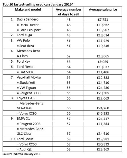 Dacia’s Sandero hatchback tied with the Duster and Ford EcoSport SUVs as January fastest-selling used cars, according to data provided by Indicata.