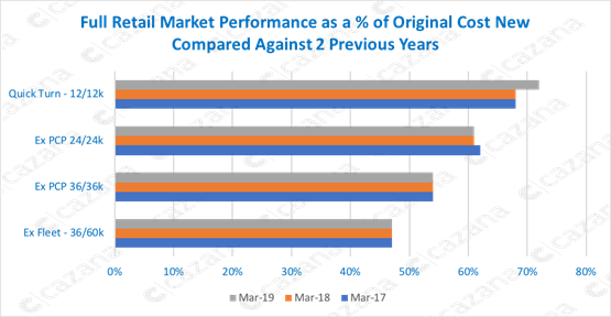 This chart compares retail pricing as a percentage of original cost new at key age and mileage profiles for the month of March 2019 with the same period in the two previous years.
