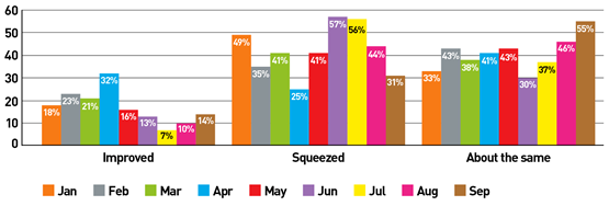 Margins have been under some pressure throughout 2015. As the graph, above, demonstrates, there have been months during the year where half or more of those responding felt they had been compressed again from the previous month. However, in recent months, this has begun to ease.