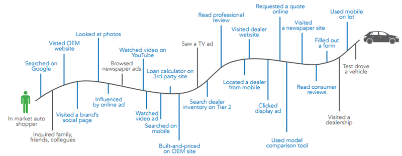 If we look at the automotive industry to highlight this consumer trend, we can see that during the purchasing process there are 24 key touchpoints (illustration below) 19 of which are now digital – including online searches, online adverts, social media pages, clicking display adverts, compared to the traditional touchpoints of newspaper adverts, visiting dealerships and seeing TV adverts.